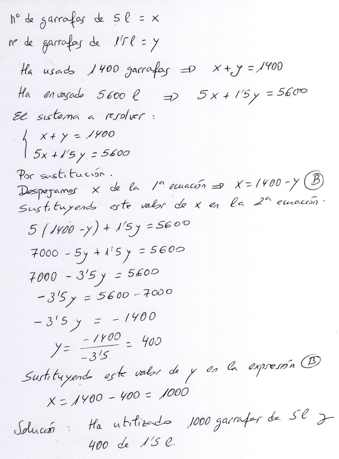 4) Una empresa aceitera ha envasado 5600 litros de aceite en 1400 garrafas de 5 y 1´5 litros. ¿Cuántas garrafas de cada clase ha utilizado?