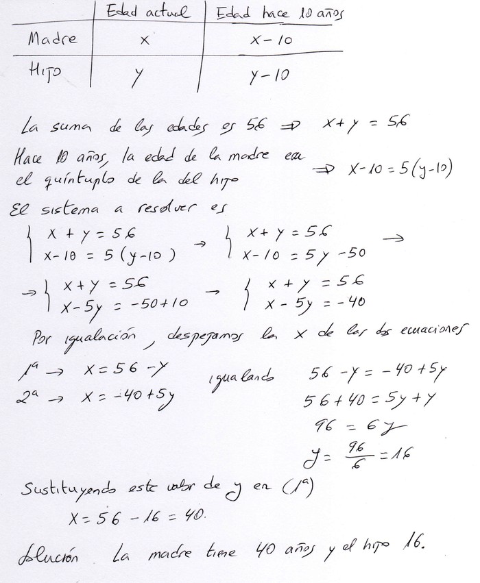 5) La suma de las edades de una madre y su hijo es 56 años. Hace 10 años, la edad de la madre era el quíntuplo de la edad que tenía el hijo. ¿Cuál es la edad actual de cada uno?