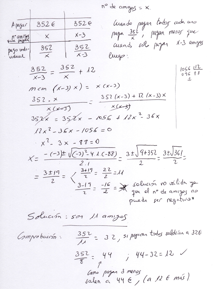 1) Varios amigos quedan para cenar en un restaurante y deben pagar 352 €. Como tres de ellos no tiene dinero, el resto debe aportar 12 € más cada uno. ¿Cuántos amigos son?