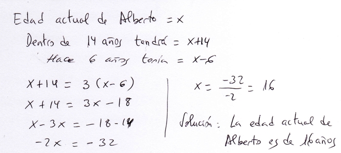 2) Calcula la edad actual de Alberto sabiendo que dentro de 14 años tendrá el triple de la que tenía hace seis años.