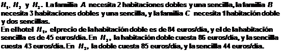 habitaciones (dobles o sencillas) que necesita cada una de las tres familias.